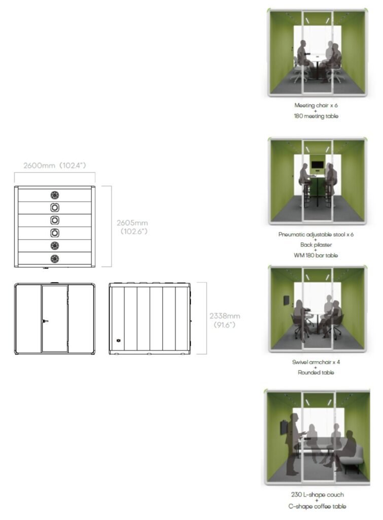 Our office pods feature an advanced environment control system, allowing users to easily adjust ventilation, lighting intensity, and colour temperature. This ensures a customised, comfortable, and productivity-boosting workspace inside every acoustic pod.